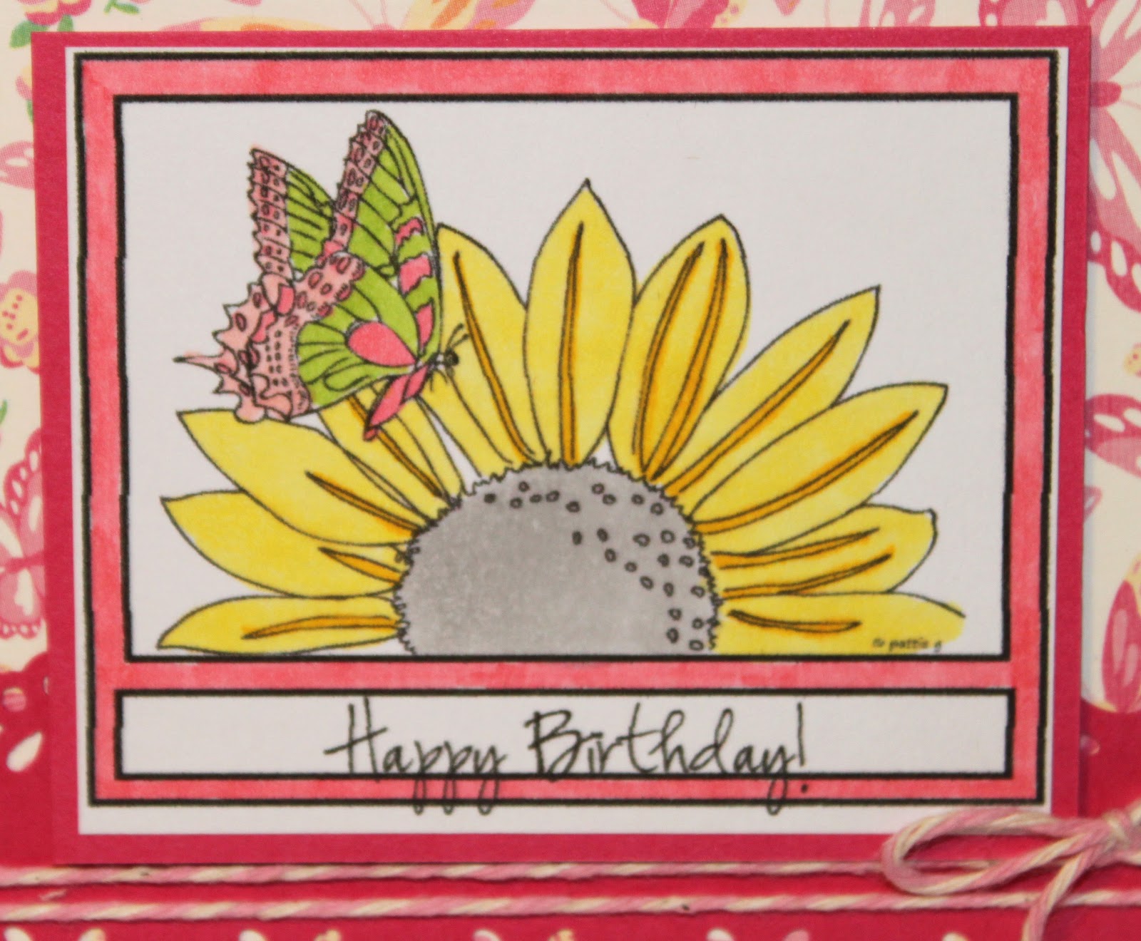 I colored the sunflower with Copics and added Stickles to different part of it. I put it in the free frame I got from Bugaboo and added the Happy Birthday in Photoshop.